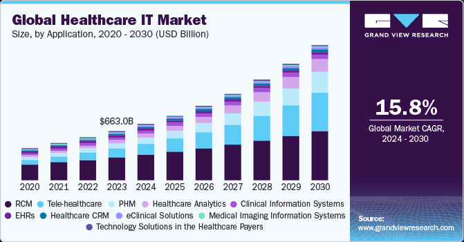 The adoption is soaring and so too is the healthcare IT market, as reflected in its impressive projected size of $663.08 billion, with a robust CAGR of 15.8% from 2024 to 2030, as Grand View Research found.